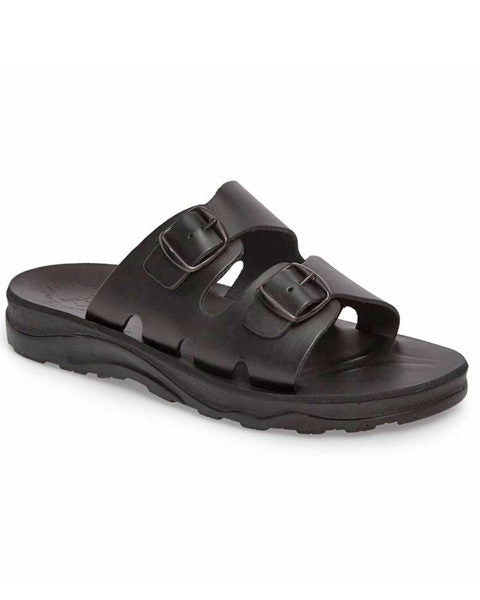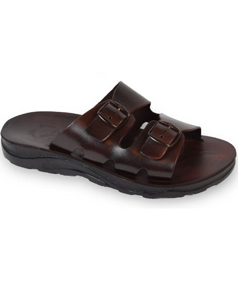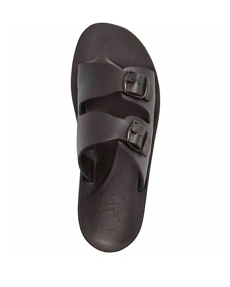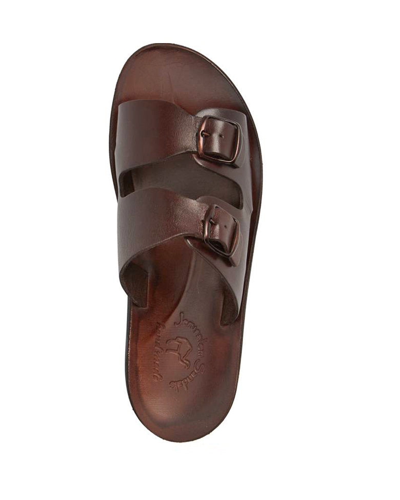 Leather sandals handcrafted in Jerusalem featuring cross straps and moulded leather footbed.
