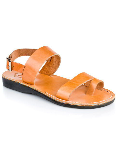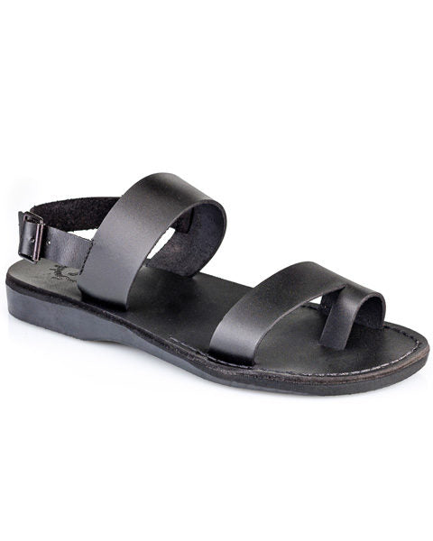 Leather sandals handmade in Jerusalem featuring two wide straps and a slingback buckle for a secure fit.