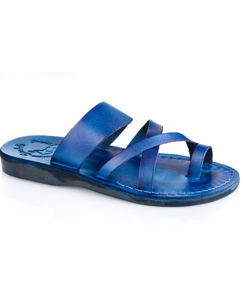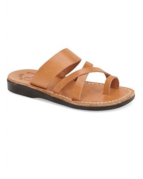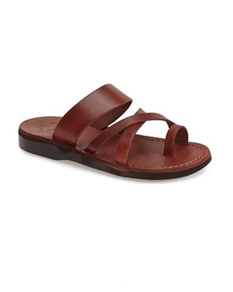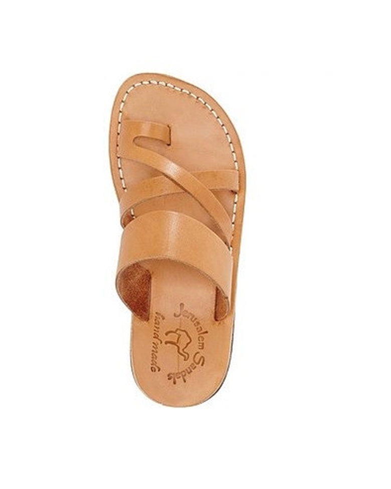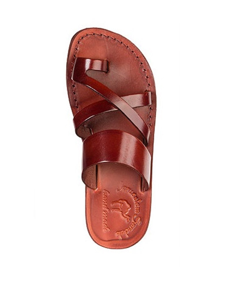 Leather sandals handcrafted in Jerusalem featuring cross straps and moulded leather footbed.