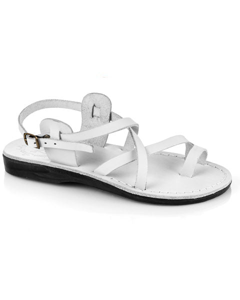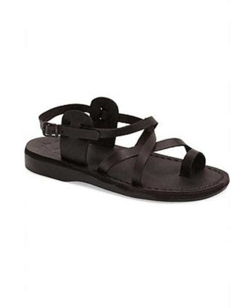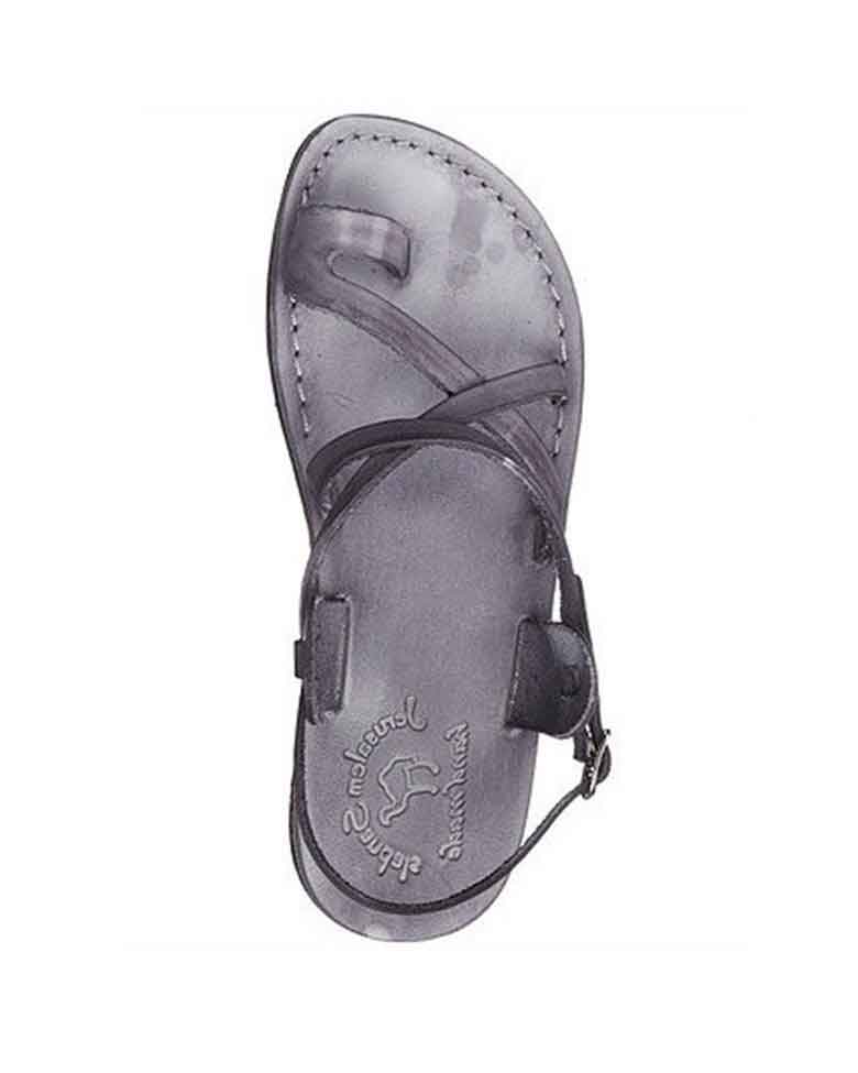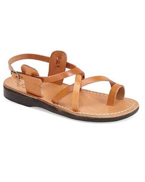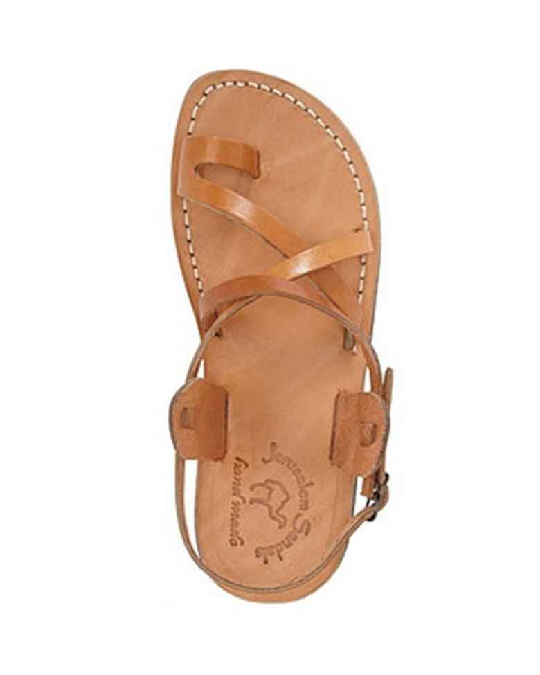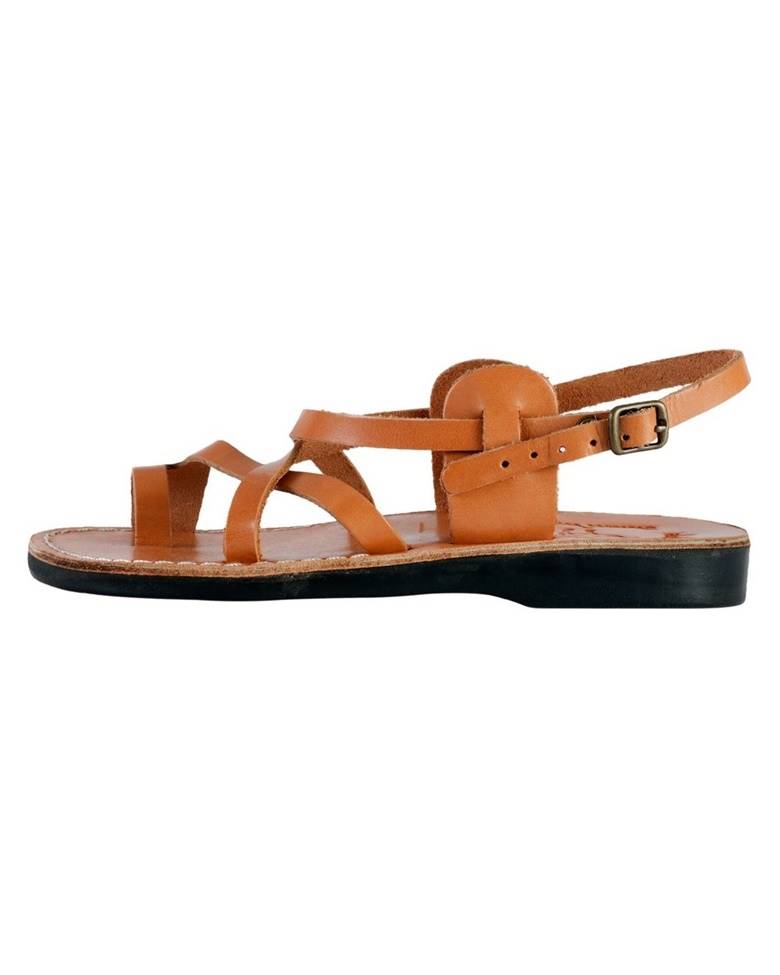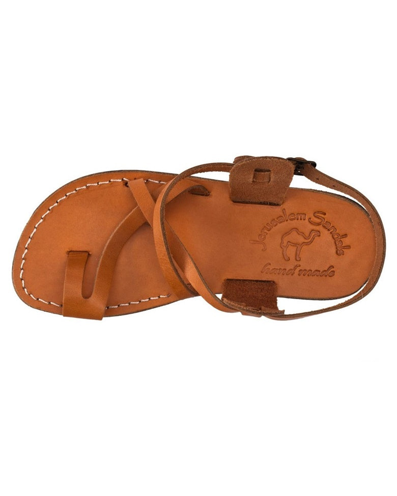 Leather sandals handcrafted in Jerusalem featuring cross straps and moulded leather footbed.