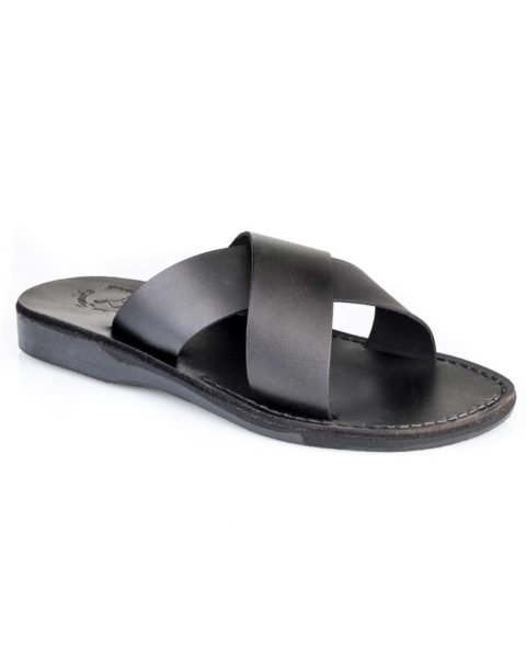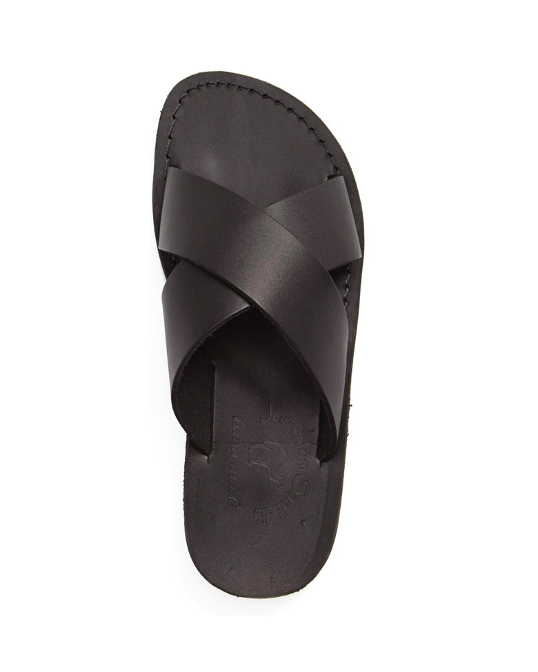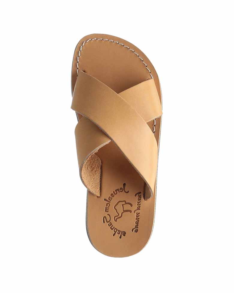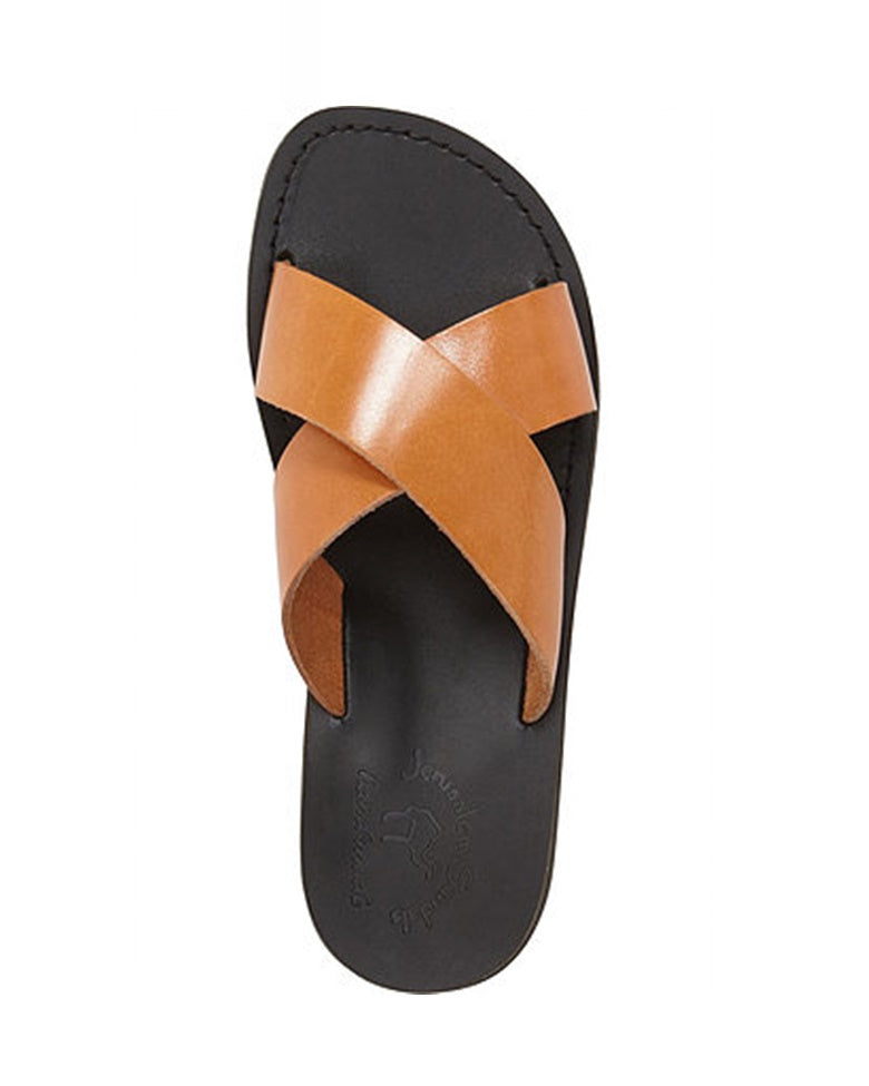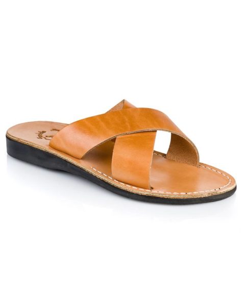 Leather sandals handcrafted in Jerusalem featuring cross straps and moulded leather footbed. These sandals are built to last for years, and the smooth leather molds to the shape of your foot for a custom fit.