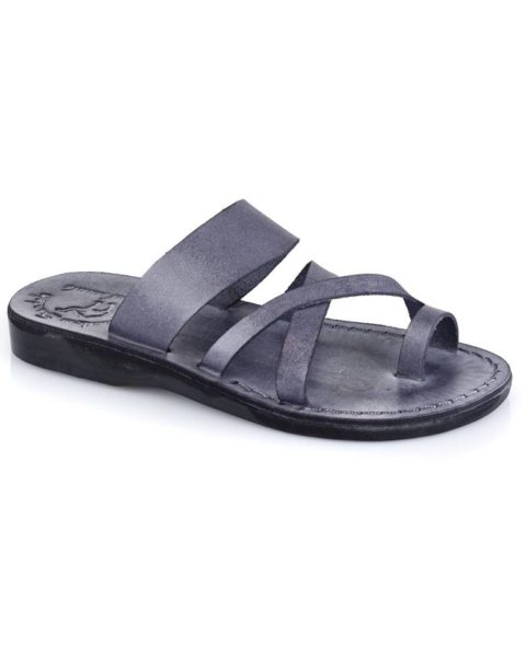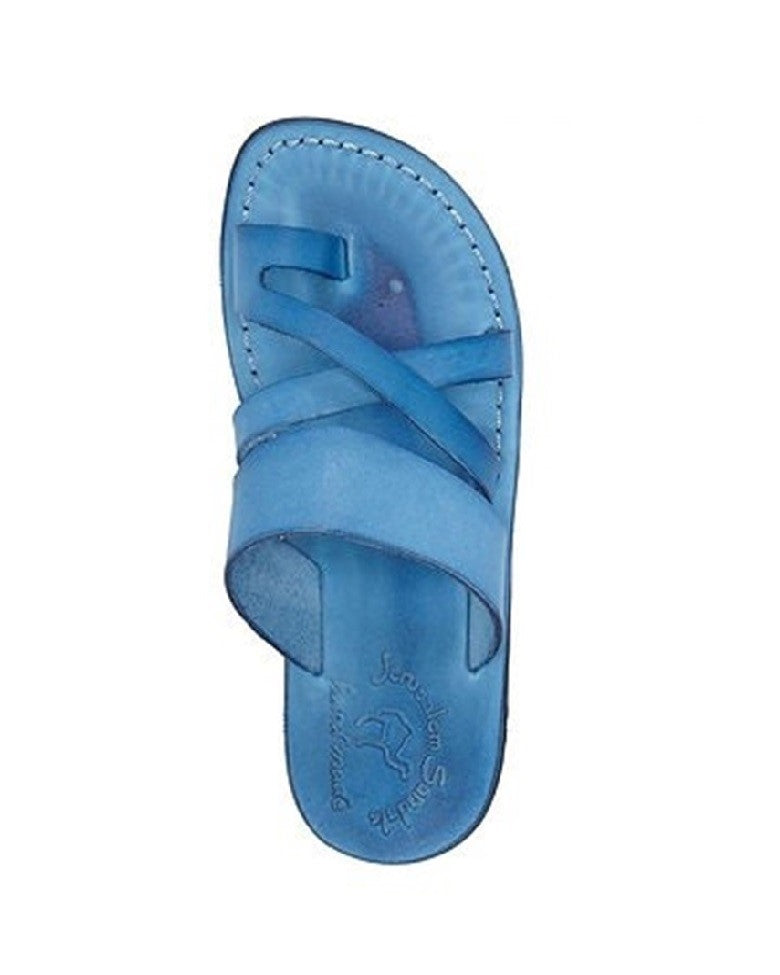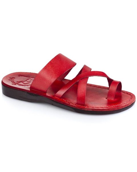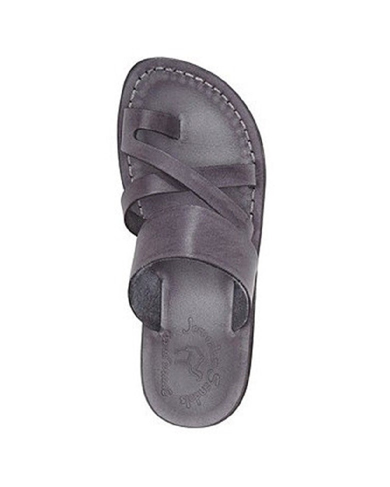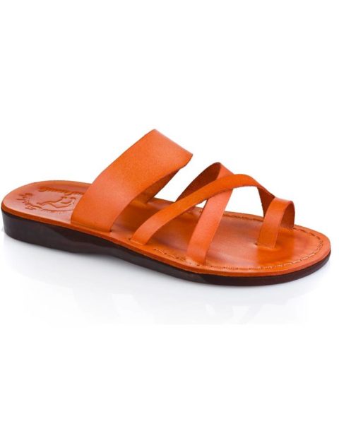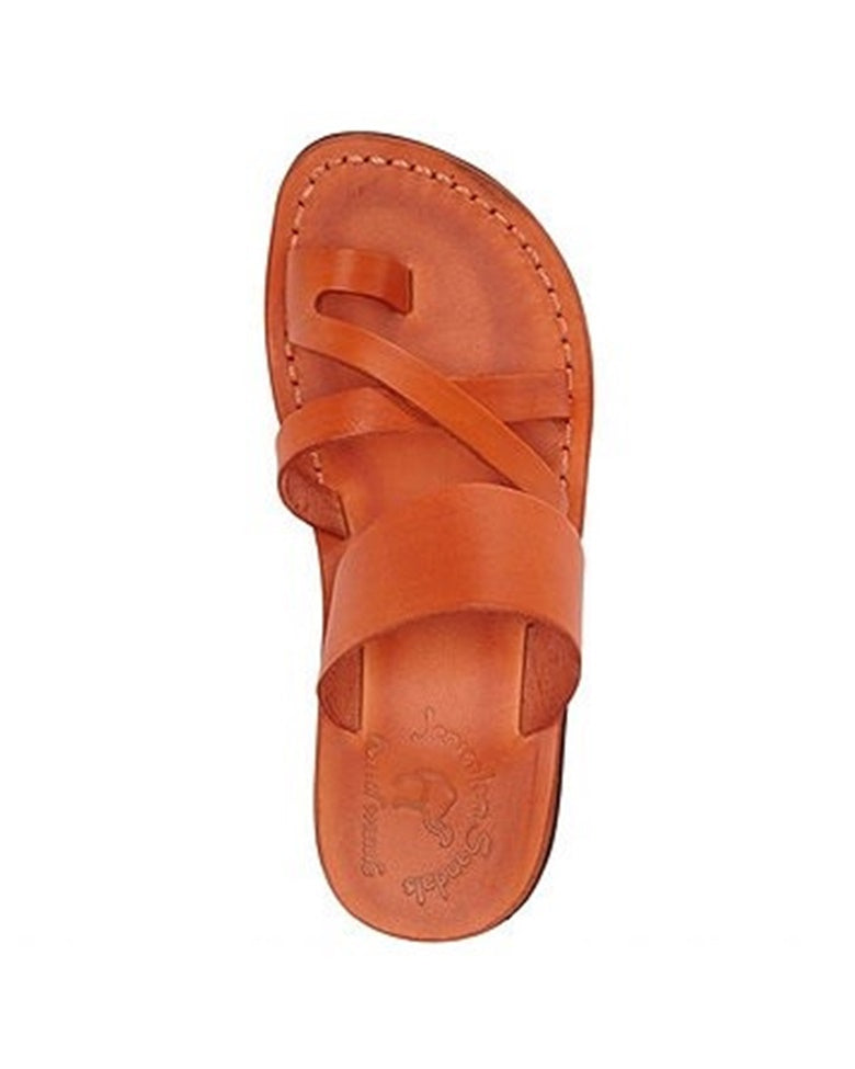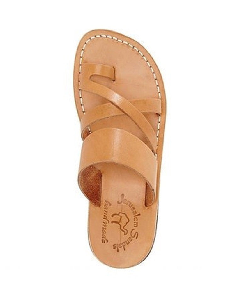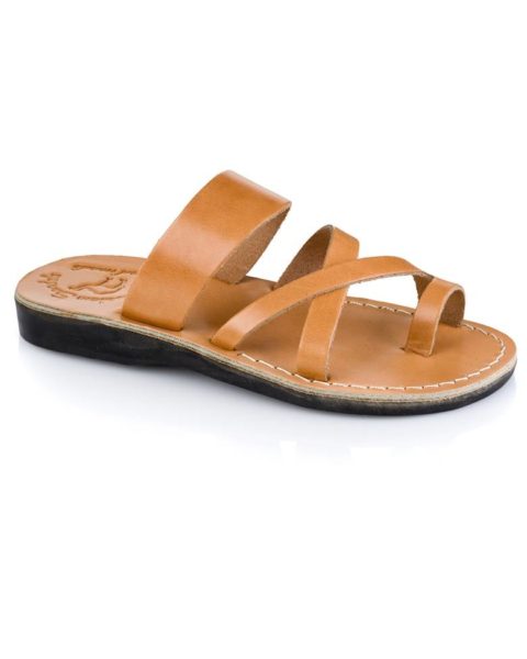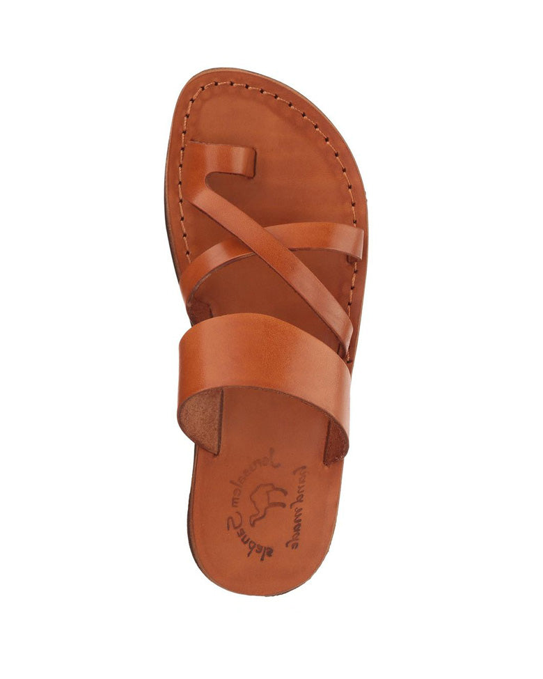 Leather sandals handmade in Jerusalem featuring cross straps and moulded leather footbed.